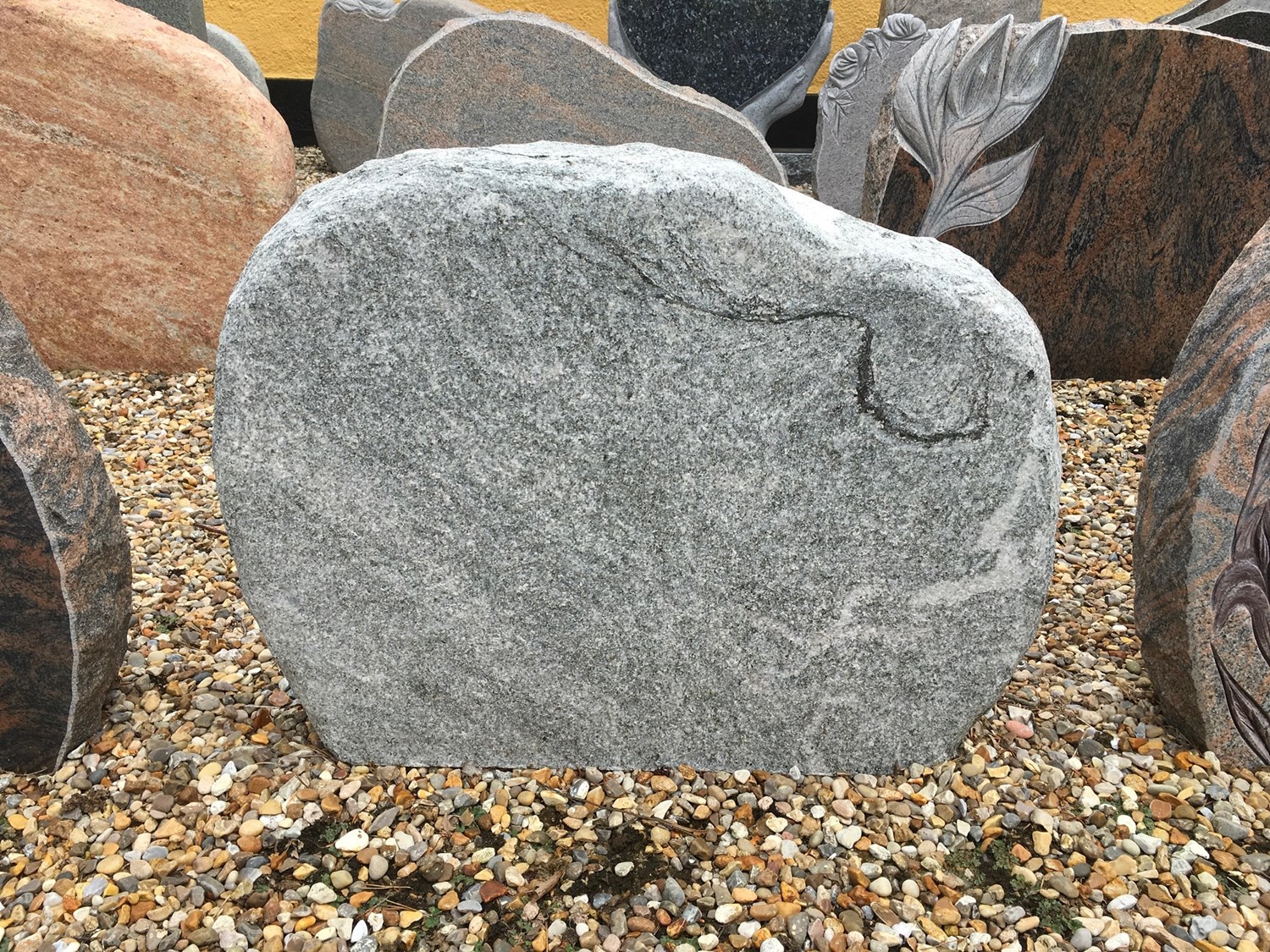 Vi anbefaler altid at se gravstenen i fysisk form, da farven ændrer sig alt efter om stenen er våd eller tør. I udstillingen har vi altid minimum 200 sten til gravsted på en kirkegård.